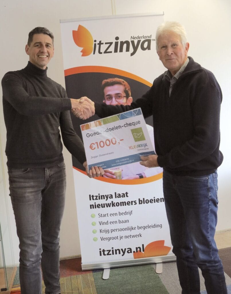 Jaap Bood, voorzitter van zowel Kringloop Kleurrijk als Fonds Kleurrijk, de ‘Goede-doelen-Pot’, overhandigde op woensdag 12 februari een cheque van € 1000,- aan de oprichter van Stichting Itzinya, Gertjan van Laar, De donatie is bestemd voor het project ‘Aan de Slag’ dat ondernemende nieuwe Nederlanders helpt bij het opzetten van een onderneming of het vinden van een baan.